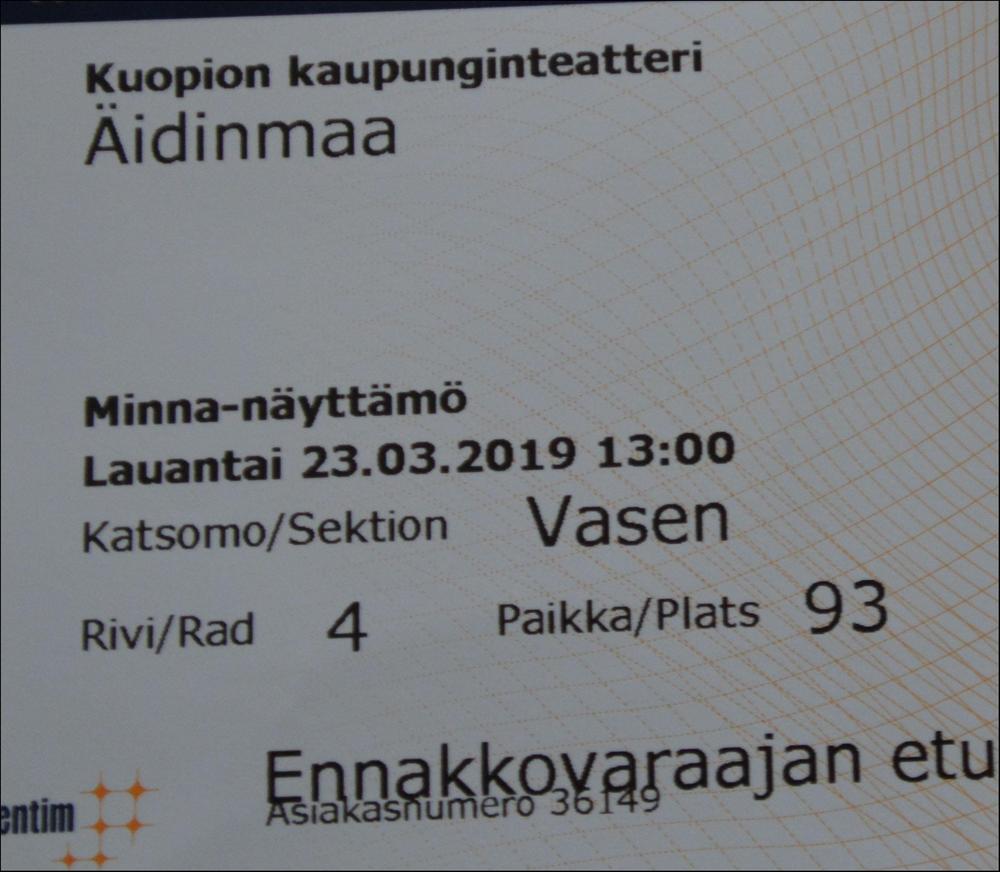 Lauantaina 23.3.2019 kävimme Kuopiossa katsomassa teatteriesityksen Äidin maa. Kiva päivä oli! Ensin oli lounas Kallavesj-ravintolassa ja sitten teatteri. Hyvä esitys!